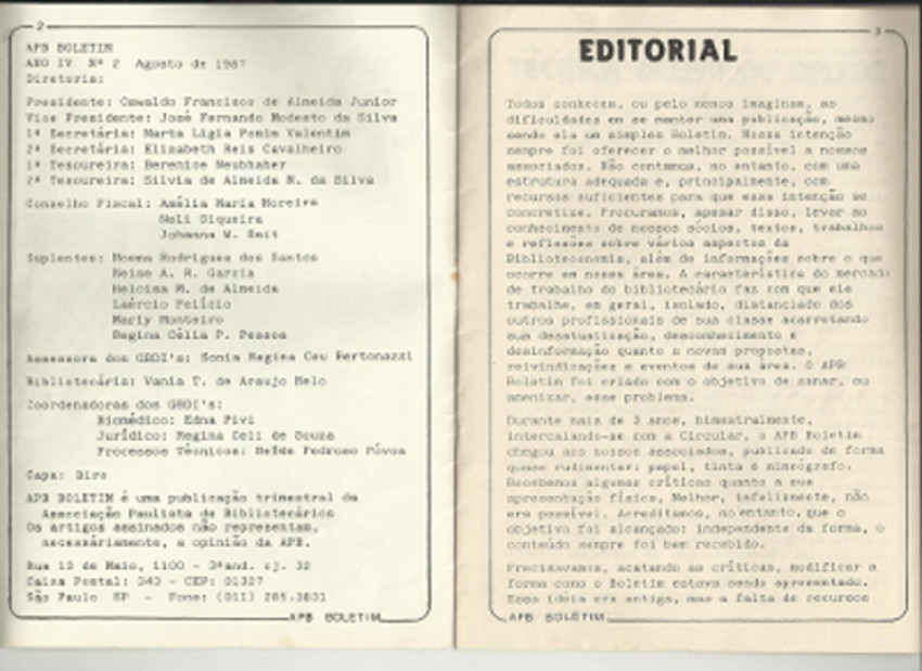 BOLETIM APB - ASSOCIAÇÃO PAULISTA DE BIBLIOTECÁRIOS - AGOSTO DE 1987