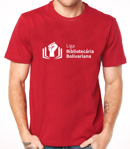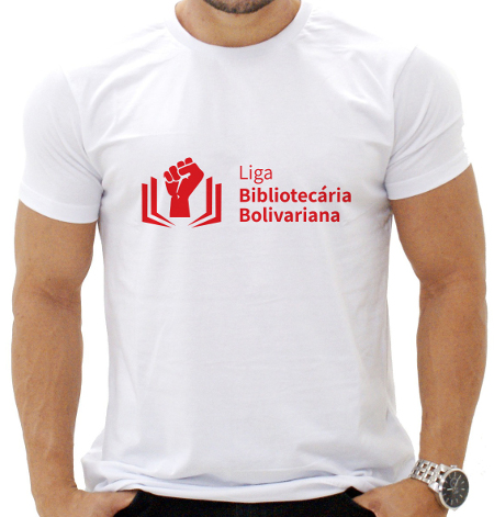 Camiseta masculina, branca e vermelha, da Liga Bibliotecária Bolivariana. Produzida em 2018.