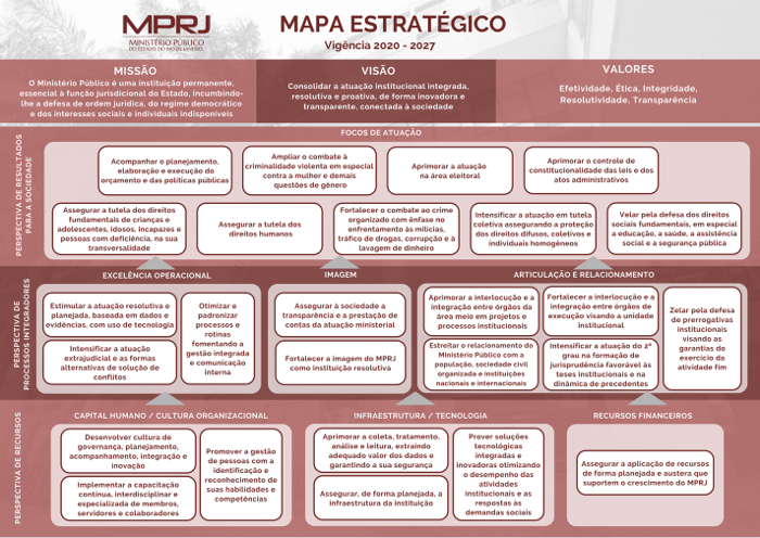 A seguir, o presente trabalho apresenta o mapa estratégico do Ministério Público do Rio de Janeiro vigência 2020-2027 para fins de ilustração.