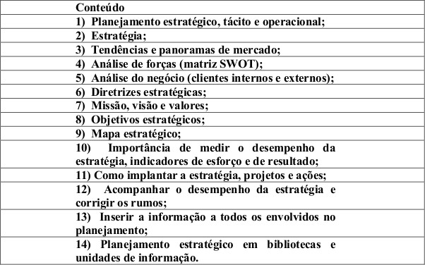Na primeira quinzena de julho de 2018, a Associação Rio-Grandense de Bibliotecários em Porto Alegre ofereceu um curso de planejamento estratégico para bibliotecas. Apresentamos a seguir, o conteúdo didático deste curso neste gráfico abaixo.