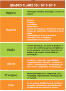 Outro exemplo concreto do uso do planejamento estratégico encontrado nas bibliotecas universitárias públicas paulistas é a versão mais recente do PLANES, Planejamento Estratégico do Sistema de Bibliotecas da Universidade de Campinas - Unicamp, 2015-2019. Os quadros a seguir, mostram o Mapa Estratégico do Sistema de Bibliotecas da Unicamp e o Quadro do Planes SBU 2015-2019 (Bracchi, 2017, p.4).