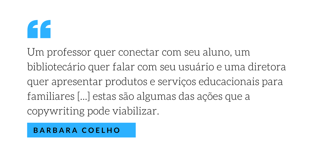 Como é possível perceber, estes três elementos em ação formam um planejamento de marketing interessante para qualquer estratégia que visa uma tomada de ação. Estes conceitos podem ser considerados como prioritários na hora de se fazer uma comunicação no contexto educacional. Um professor quer conectar com seu aluno, um bibliotecário quer falar com seu usuário e uma diretora quer apresentar produtos e serviços educacionais para familiares [...] estas são algumas das ações que a copywriting pode viabilizar.