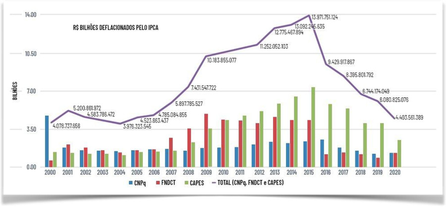 A imagem acima fala por si só, mas não custa nada apontar os dados do jornal Direto da Ciência (2020), onde foi destacado que de todo o montante de R$ 4,9 bilhões destinados ao FNDCT (Fundo Nacional de Desenvolvimento Científico e Tecnológico), 87,7% estão congelados e não poderão ser usados. No caso específico do CNPq (Conselho Nacional de Desenvolvimento Científico e Tecnológico), o valor destinado exclusivamente ao fomento científico encolheu 84,4% em 2020. Isso em plena situação de pandemia, onde o setor científico - por meio de seus cientistas, pesquisadores e infraestrutura - é o mais demandado para responder rapidamente.