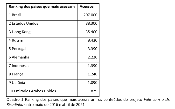 Os acessos provenientes de outros países, em alguma medida, evidenciam a relevância e visibilidade social do projeto para aqueles que buscam informação em saúde confiável em língua portuguesa e que seja de fácil compreensão.