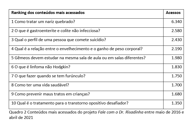 Os conteúdos demandados pela população e buscados no projeto são os mais variados, incluindo questões do dia a dia, doenças raras, saúde mental, qualidade de vida e questões que envolvem o desenvolvimento humano em sentido amplo. O quadro 2 apresenta seus conteúdos mais acessados.