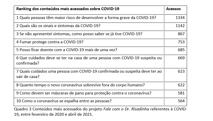 Especialmente entre fevereiro de 2020 e abril de 2021, foram produzidos 69 conteúdos sobre COVID-19. As questões recebidas e respondidas sobre COVID-19 também foram muito variadas e evidenciaram uma preocupação da população em como se proteger da pandemia. O Quadro 3 apresenta os conteúdos mais acessados sobre COVID-19.