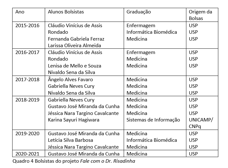 Para manutenção de suas atividades, o projeto Fale com o Dr. Risadinha contou com 16 bolsas para alunos de graduação obtidas junto à Universidade de São Paulo por meio do Programa Unificado de Bolsas, bem como uma bolsa de iniciação científica obtida junto ao CNPq, via UNICAMP, conforme apresentado no Quadro 4, gerando um custo total em bolsas no valor de 81.600 reais.