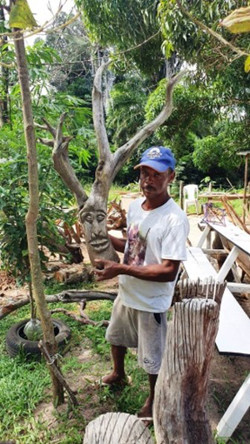 Quando se avista o artista próximo ao seu ateliê (que não é um espaço formal, separado por paredes, mas está ao ar livre, numa encruzilhada da saída do bairro Ribeirinho em direção à praia da Cueira) não se tem a dimensão da força criativa dele.