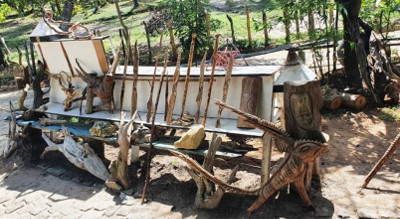 No local, Leno expõe trabalhos e ao, mesmo tempo, tem um jirau pra trabalhar nas peças, cortar, serrar, talhar, dar forma, aperfeiçoar artisticamente a infinidade de matéria que a natureza ao seu redor oferece: galhos, raízes, pedras, cocos, restos de madeira de construção. O artista não derruba árvores para ter matéria-prima para as esculturas, apenas aproveita o que cai na mata, ou rejeito de obra ou que foi arrancado em alguma outra circunstância.