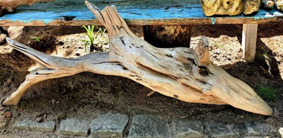 Ali, junto à exuberância da natureza, o artista, sua sensibilidade e habilidade em esculpir em raízes dão boas vindas a quem chega a Boipeba. Trata-se de uma das esculturas de Leno.
