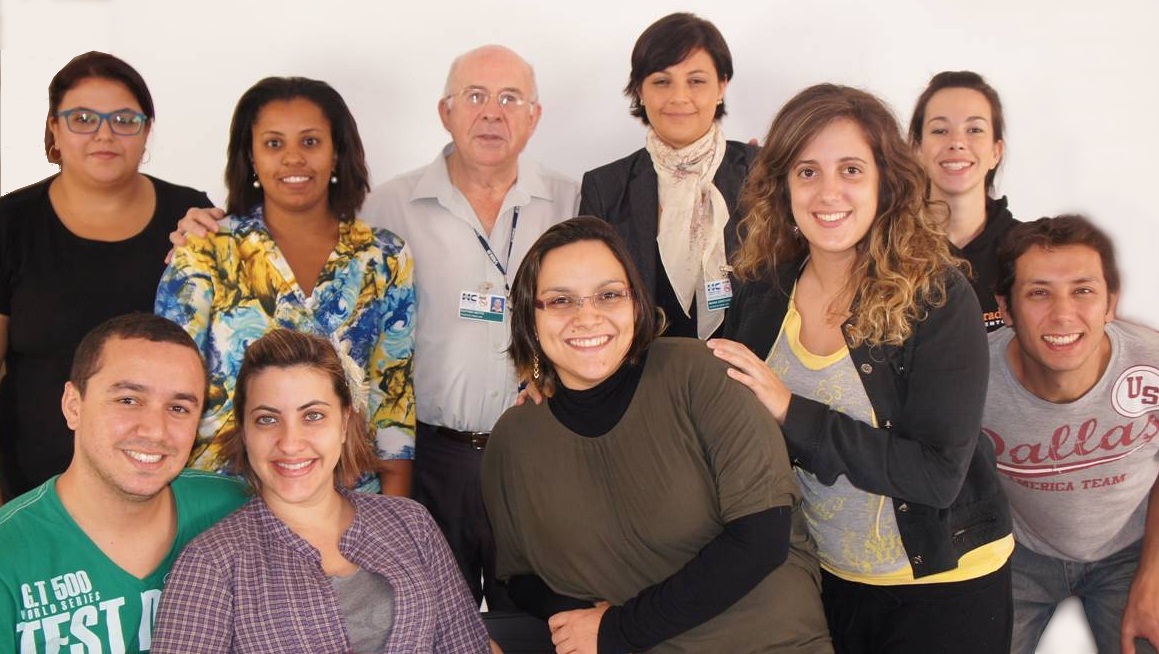 Aparecem na foto, no centro ao fundo, o Professor Ruffino, tendo à sua direita a assistente social Renata Belarmino, à sua esquerda a Professora Cristiane Galvão, e ao redor os membros da Cia Expresso Riso.