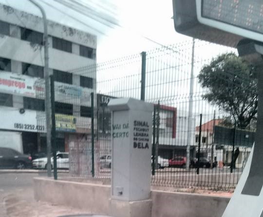 Em Fortaleza-CE, cidade onde nasci e resido, é possível identificar várias paisagens marcadas por frases ou mesmo pelo graffitti apenas deslocando-se por suas ruas e avenidas. Certo dia, no trajeto de casa para o trabalho, decidi registrar duas imagens por terem chamado minha atenção. Uma delas estava estampada num poste de fiscalização instalado pela prefeitura com o objetivo de reduzir o número de infrações de trânsito, tais como avanço de sinal vermelho ou estacionamento sobre a faixa de pedestres. E, uma segunda, bem maior do que a primeira, cobria a fachada de um antigo prédio localizado numa das avenidas do centro da cidade. Esta chamou minha atenção não só pelo tamanho, mas principalmente pela diversidade de cores em meio a paisagem quase monocromática do local. Os prédios próximos, em sua maioria, deteriorados, contrastavam com aquele que sediava a intervenção artística reproduzida logo abaixo: