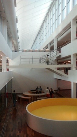 A área interna é sofisticada, bem cuidada como deve ser uma biblioteca, diferente do que quase sempre vemos no país, ou seja, lugares improvisados, com apenas o mínimo para o funcionamento: cada espaço, cada equipamento tem sua função e foi pensado por profissionais de diversas áreas para se levar à leitura, à informação, ao lazer, como apresenta o site da Biblioteca (2016):