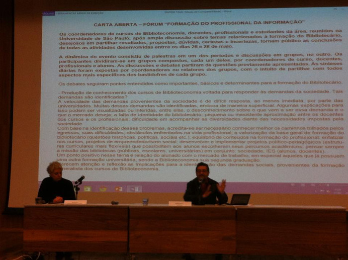 Fórum: Formação do Profissional da Informação - USP - Auditório Biblioteca Brasiliana - 2014 - Presentes na mesa: Oswaldo Francisco de Almeida Junior e Ivete Pieruccini