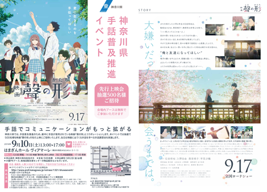 Outra ação, essa realizada durante o mês de setembro de 2016 pela prefeitura de Kanagawa, por meio do Departamento de Saúde e Bem-Estar, buscou promover a difusão da Língua de Sinais Japonesa (Prefeitura de Kanagawa, 2016a). O evento contou com a exibição antecipada do filme, além de aulas de Nihon Shuwa para a população presente durante o período de acontecimento do evento.