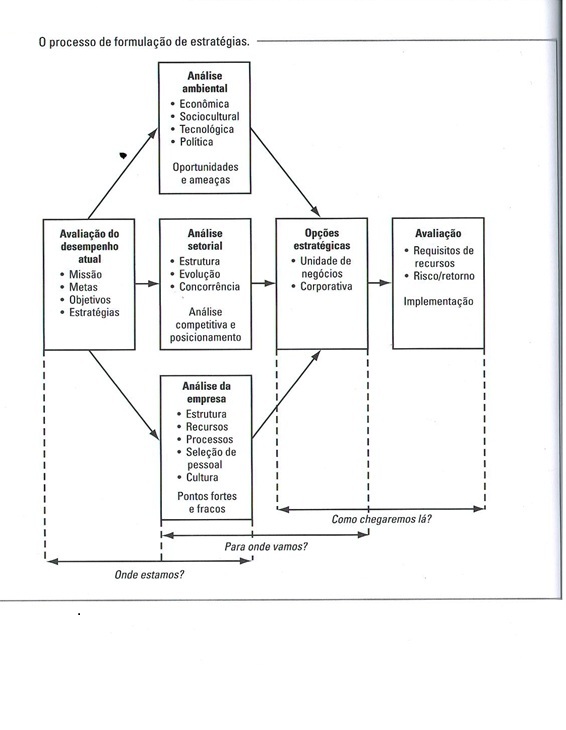 De acordo com Kluyver e Pearce (2007, p.13) O processo de criação de uma estratégia pode ser organizado com base em três perguntas-chave, ou seja, onde estamos? Para onde vamos? E como chegaremos lá? (gráfico abaixo) Cada pergunta define uma parte do processo e sugere diferentes tipos de análises e avaliações. Eles também mostram que os componentes de uma análise estratégica se sobrepõem e que ciclos de feedback representam uma parte integrante do processo.
