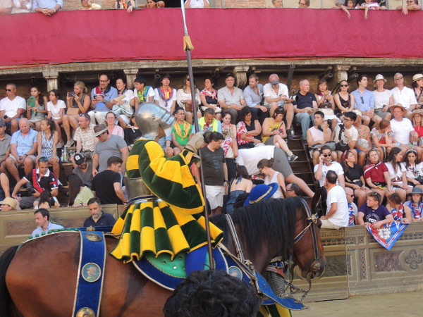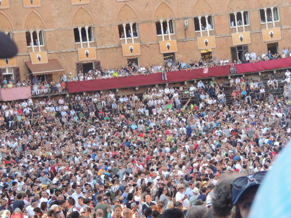 Em vez de belos e belas sambistas, a vez é de garbosos animais. Isto porque, o ápice da festividade é exatamente a corrida, em que apenas 10 cavalos, cada um de uma contrada de três regiões da cidade, são sorteados. Ganha o cavalo que chegar primeiro, após três voltas ao redor da praça, momento em que a multidão vai à loucura com gritos, palmas, vaias, fogos de artifício, buzinas, apitos, etc. Tudo vale para conquistar o estandarte (o pallium ou o “Drappellone”), sempre em pano precioso e exclusivo para cada ano, sob o encargo de um artista local ou, eventualmente, de fora. O palio é a única corrida do mundo onde tudo é permitido: golpes baixos, obstáculos aos adversários, mudanças de lugar... Quer dizer, toda a ação dos jóqueis é minuciosamente planejada em busca da vitória! O palio, surpreendentemente, é um acontecimento que divide a pequena cidade! E é óbvio que os turistas, desavisados ou “inocentes”, em suas variadas procedências e seus idiomas entram na onda de animação total, sem no entanto, paradoxalmente, esquecer, o celular!
