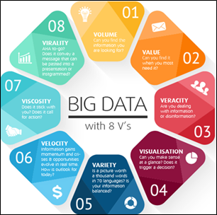 O big data apresenta como características principais: volume (quantidade de dados produzidos); velocidade (com que os dados são produzidos); variedade (de formatos e canais de distribuição). Além disso, existem outras características que também estão presentes: veracidade (qualidade dos dados); valor (importância dos dados); volatilidade (duração da utilidade dos dados); validade (autenticidade dos dados); variabilidade (diferenciação dos dados); visualização (representação abstrata dos dados); vulnerabilidade (riscos e segurança dos dados); viralização (propagação dos dados); viscosidade (diferença entre a ocorrência do evento e a descrição do evento); vagueness (imprecisão dos dados); venue (diferentes plataformas de dados); vocabulário (terminologia dos dados); verbosity (redundância dos dados); e versalidade (flexibilidade de uso dos dados).
