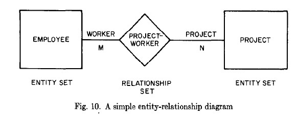 A Figura 01, extraída do texto de Chen, ilustra o conceito de entidade e relacionamento sob aplicação da metodologia. Cada conjunto de entidades é representado por uma caixa retangular e cada conjunto de relacionamentos é representado por uma caixa em forma de losango. O fato do conjunto de relacionamentos definido entre conjuntos de entidades (Trabalhador e Projeto) é representado pelas linhas que conectam as caixas retangulares. Os papéis das entidades no relacionamento são declarados.