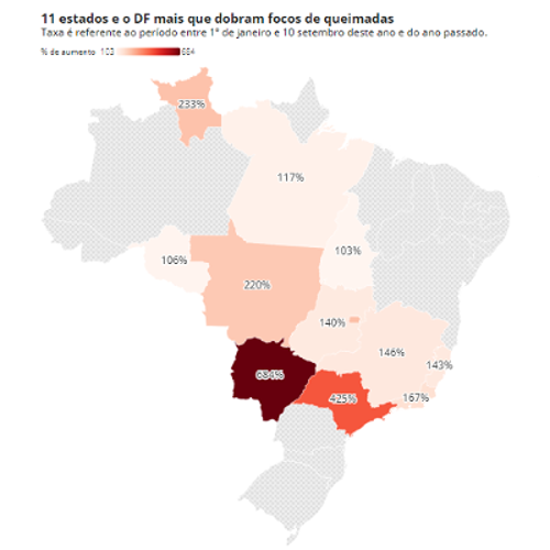 O Brasil concentra 71,9% das queimadas na América do Sul nas últimas semanas e/ou dias. Todos os anos na temporada de queimadas, que vai de julho a outubro, há fumaça na atmosfera, mas, poucas vezes, ela foi vista no Sudeste e no Sul. Segundo os dados do renomado Instituto Nacional de Pesquisas Espaciais (Inpe), a alta do índice de incêndios no Brasil e da fumaça é atribuída às regiões Sudeste e Centro-Oeste, onde todos os Estados mais que duplicaram os nefastos números. O RS, por sua vez, que não tem alto índice de fogo, teve uma chuva preta, resultado da fumaça sobre o RS.