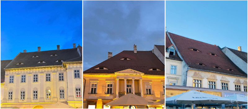 Seus olhos ou nossos olhos avistarão um delicado panorama de casinhas ou casarões estruturados em três praças – Praça Muito Pequena; Praça Pequena; Praça Muito Pequena – com mil olhinhos. É lindo de se ver. É possível que os olhinhos cuidem de amenizar a escuridão nos dias de inverno. É possível que os olhinhos cuidem da vida dos vizinhos. É possível que os olhinhos estejam lá para assegurar a beleza da cidade! Na verdade, os olhinhos de Sibiu são janelas-sobrancelhas que se postam faceiras nos telhados multicoloridos. Foram eles instalados entre os séculos 15 e 19 como sistema de ventilação para os sótãos. Faz sentido, como também faz sentido chamar Sibiu de “A cidade onde as casas não dormem”, em vez de gracejos brasileiros de que Sibiu pode ser xibiu, numa alusão a uma das partes do corpo feminino, formalmente a vulva (admirada por muitos homens), mas que, dentre as mil denominações que rolam por aí, estão xoxota, xereca, periquita e lá vai mais, o que dá vazão à brincadeira inocente de chamar nossa guia romena de “Xibi” ou algo que assim o seja.