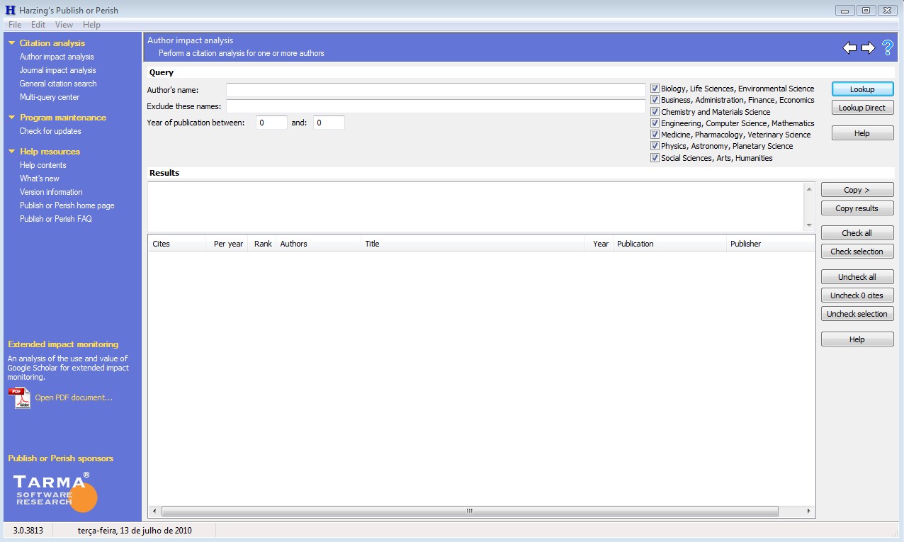 O aplicativo é desenvolvido por Harzing.com. É gratuito para uso pessoal sem fins lucrativos. Também é nativo para o ambiente do Microsoft Windows, podendo ser instalado em ambientes operacionais do Apple Mac OS X e GNU / Linux, por meio de um emulador. Para a instalação no ambiente Windows, o software pode ser baixado diretamente do endereço: http://www.harzing.com/pop_win.htm, onde há instruções de instalação a serem seguidas pelo bibliotecário. Na figura 1 apresenta-se a tela inicial do software pronta para realização das consultas.