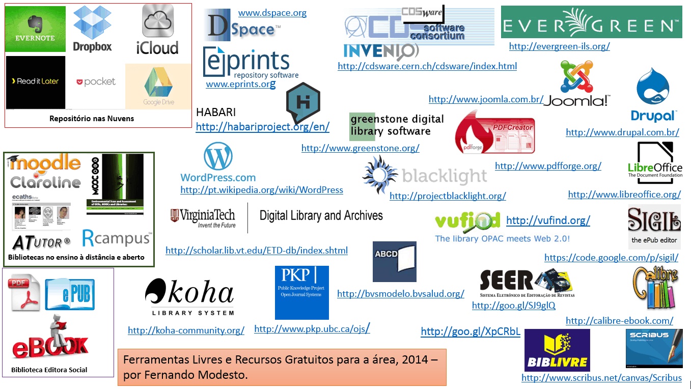 Ferramentas de uso livre para a construção de produtos bibliográficos como: catálogos online, repositórios científicos e sociais, revistas eletrônicas, portais ou blogs, e editoração eletrônica estão à disposição dos bibliotecários para proverem conteúdo digital, e estabelecerem posição na rede, com baixo custo. Abre-se oportunidades de negócio, aos bibliotecários que desejam atuar como consultores ou fornecedores de serviços, explorando os diversos softwares livres na geração de produto e capacitação e treinamento de equipes em bibliotecas. Na figura 1 apresenta-se uma ilustração dos possíveis recursos gratuitos e programas livres para uso em bibliotecas, justificando possibilidades mencionadas.