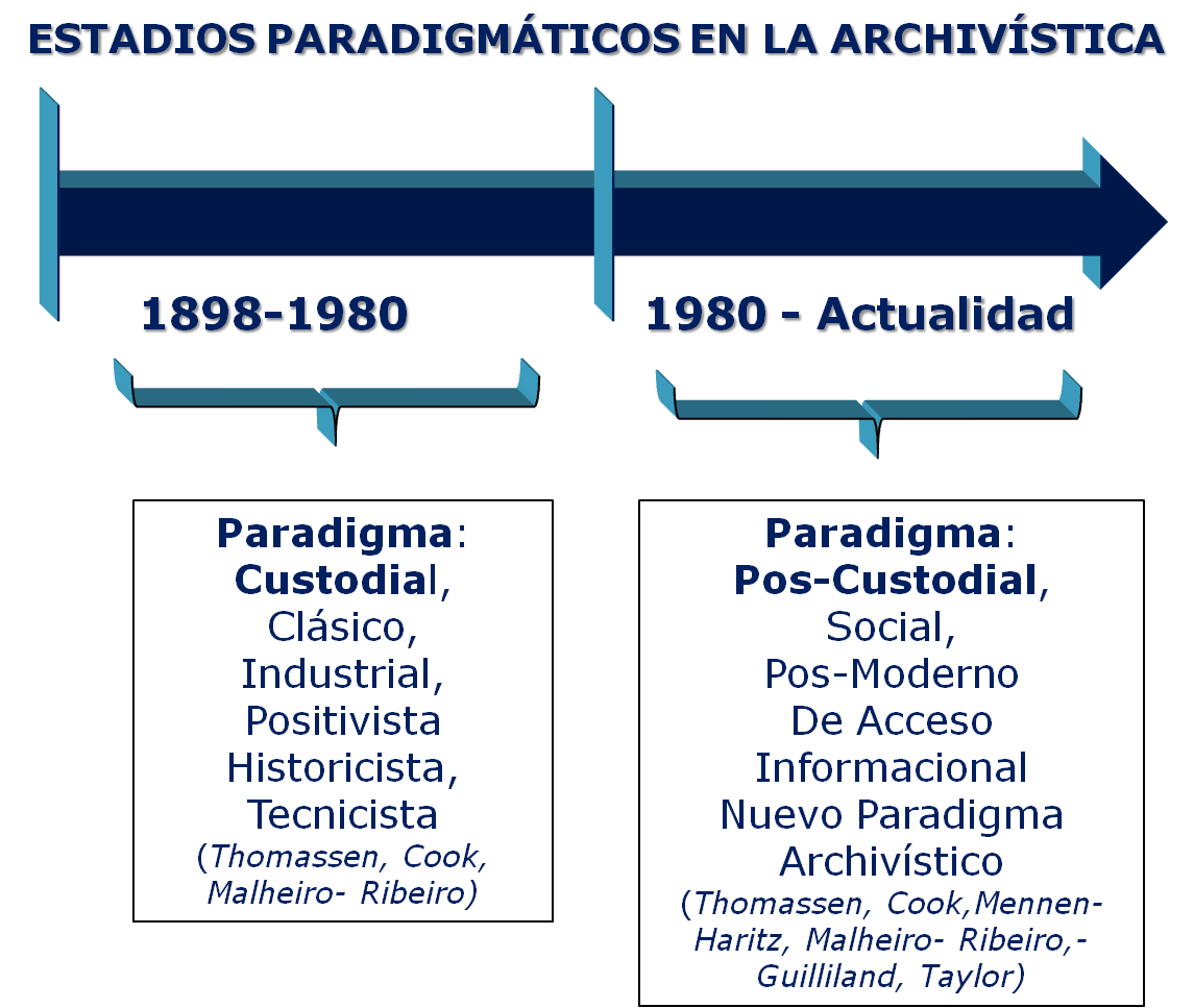 Ahora bien, si se aplica la noción de paradigma, propuesta por el físico, historiador y sociólogo de la ciencia Thomas Khun, a la Archivística se puede determinar que esta ciencia, aunque joven, ya ha transitado por cambios paradigmáticos importantes. Varios son los autores que han definido los estadios paradigmáticos de la disciplina que estudia los documentos archivísticos. A continuación se muestra una figura que ejemplifica, a modo de resumen, los dos estadios paradigmáticos de la Archivística desde su surgimiento hasta la actualidad, sus diferentes denominaciones y los autores más conocidos que han estudiado este tema.